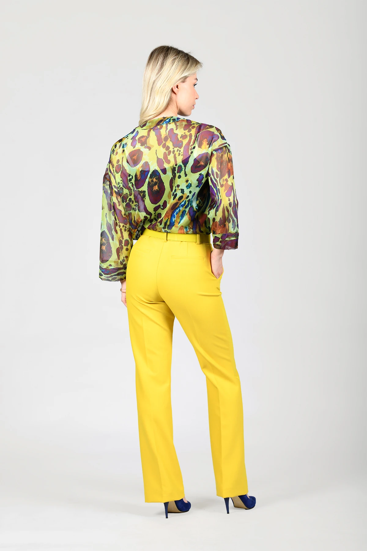 Sarı kemerli kumaş pantolon, enerjik rengi ve zarif kesimiyle stilinize sofistike bir dokunuş katıyor. Yüksek beli ve akıcı kumaşı sayesinde konforu ön planda tutarken, belindeki kemer detayı şıklığı tamamlıyor. Hem ofis kombinlerinde hem de günlük şıklıkta rahatça kullanabileceğiniz bu pantolon, gardırobunuzun favori parçalarından biri olacak.